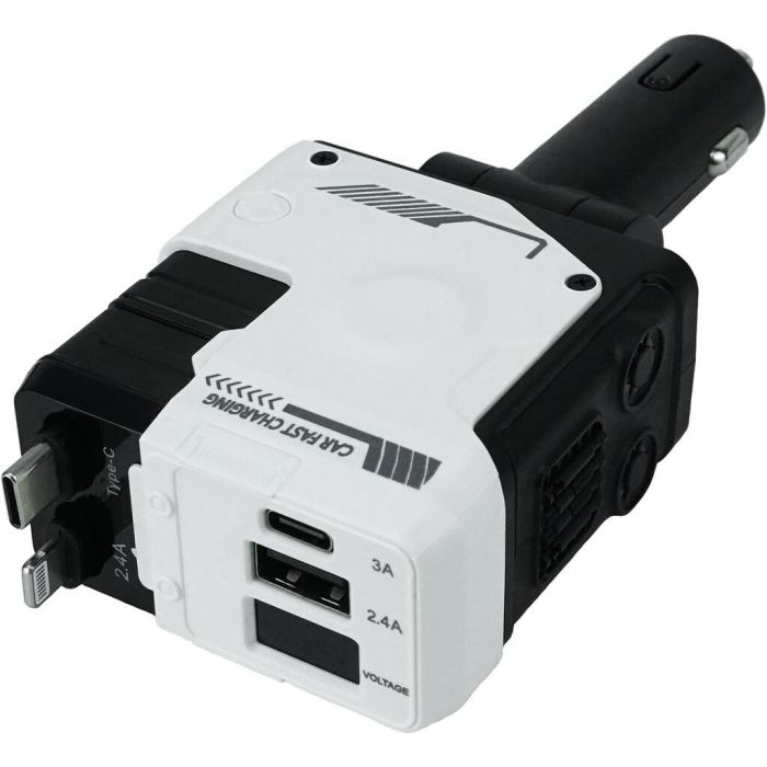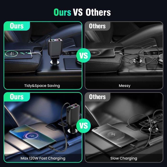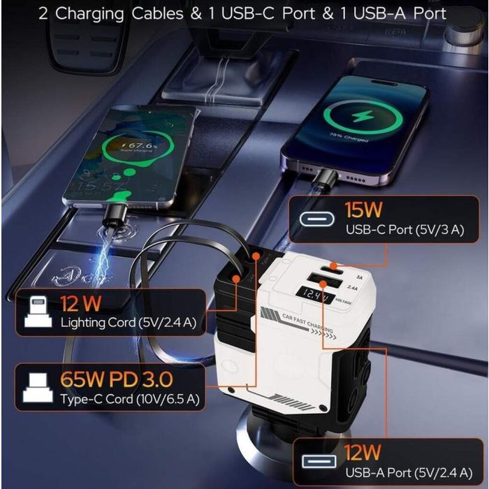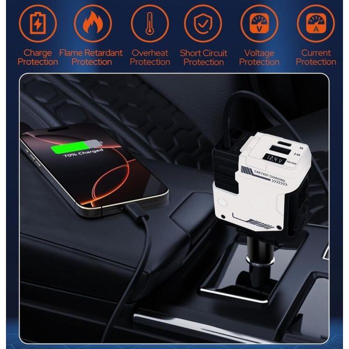 - شاحن سيارة فائق السرعة 4 في 1 بمنفذين مع كيبلات USB-C وLightning قابلة للسحب