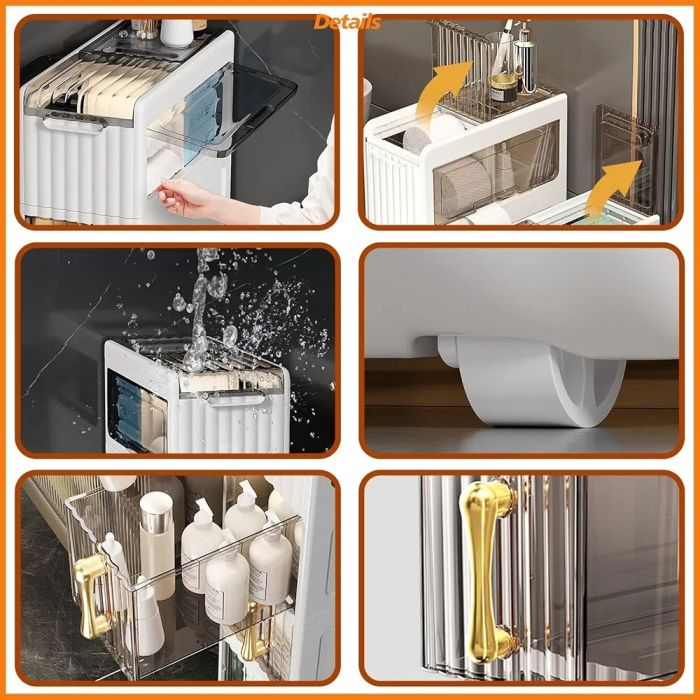 - تخزين الأدوات المكتبية مثل الملفات والتذاكر، والكتب، والمشروبات، ومستلزمات الحمام، والمحارم الورقية، والمناشف، وغيرها بسهولة
