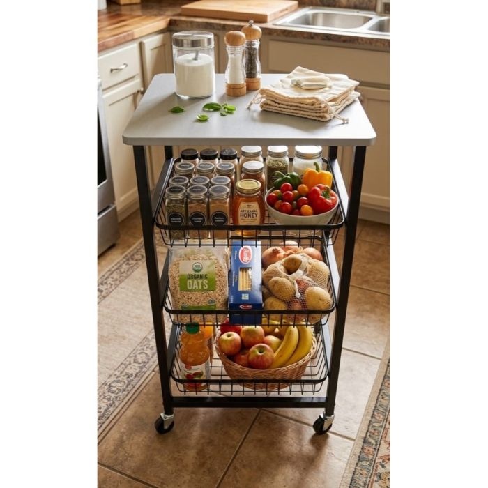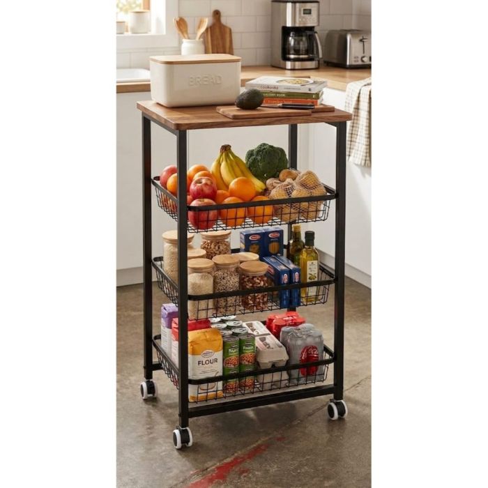 عربة تخزين مطبخ 4 طبقات بعجلات مصنوعة من معدن متين مع سطح علوي بتصميم خشبي، مزودة بسلال قابلة للسحب لتنظيم الفواكه والخضروات والمستلزمات اليومية، سهلة الحركة والتخزين، مناسبة للمطبخ والحمام والمكتب