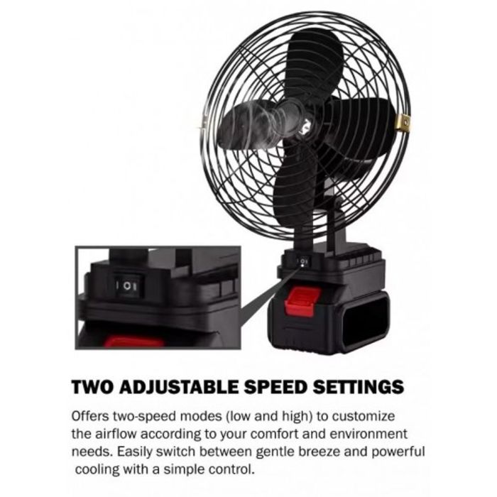 مروحة ميني بمحرك 35 واط وبطارية ليثيوم 48 فولت قابلة لإعادة الشحن توفر تدفق هواء قوياً وثابتاً لساعات طويلة. لاسلكية وخفيفة تناسب المخيم والطوارئ، مع سرعات قابلة للضبط وتشغيل هادئ.