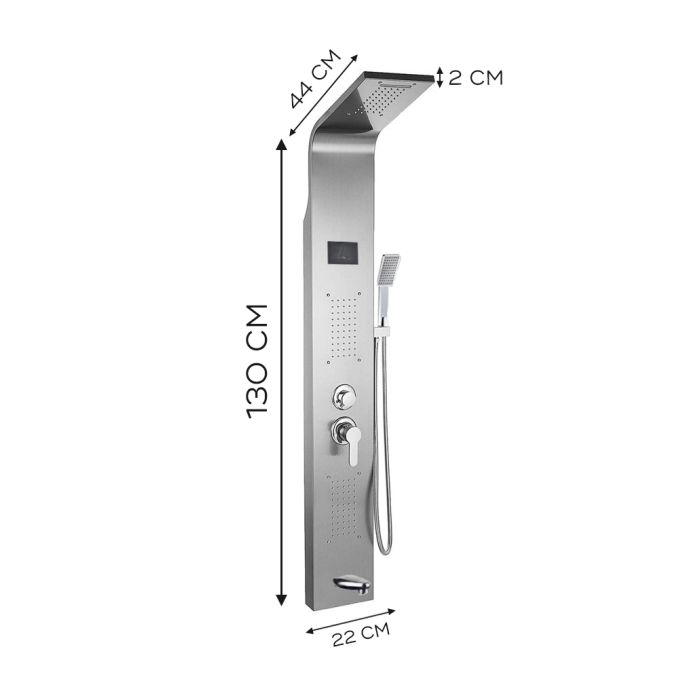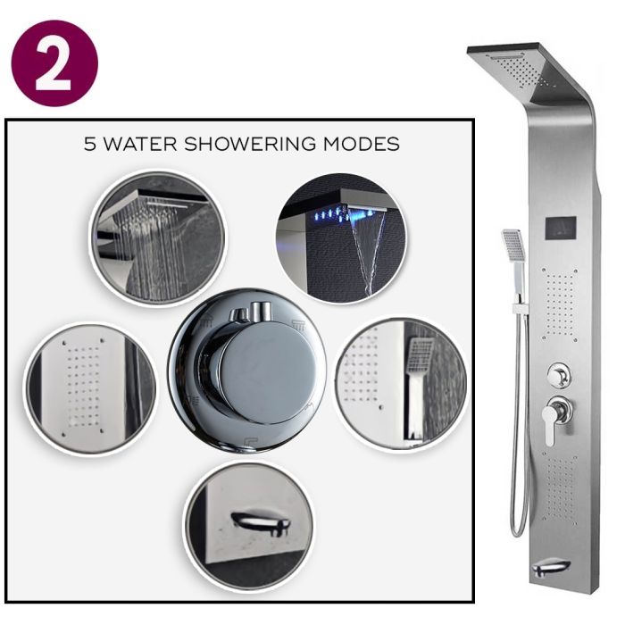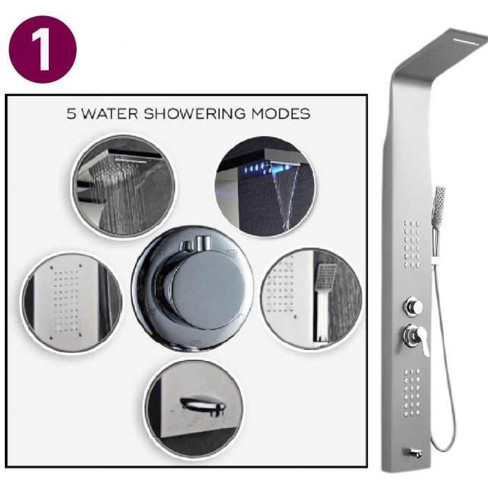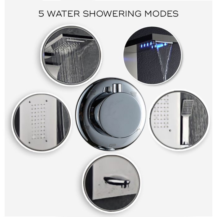 - 5 وظائف: دش رذاذ مطر علوي، دش شلال مياه علوي، رذاذ تدليك جانبي، دش محمول باليد، صنبور حوض استحمام سفلي