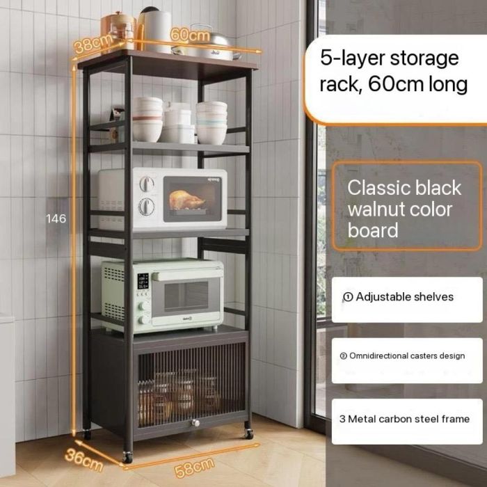- خمس طبقات رفوف مصمّمة للفرن، الميكروويف، وتخزين مستلزمات المطبخ.