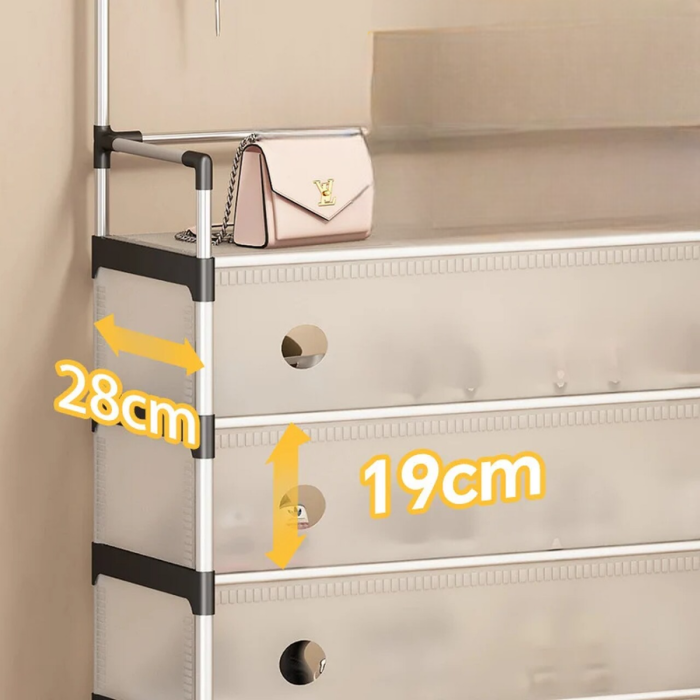 قم بتنظيم أحذيتك بأناقة مع رف الأحذية المتين والواسع هذا المكون من خمس طبقات يتميز هذا الرف بهيكل معدني قوي وعلاقات إضافية للحقائب أو الإكسسوارات وغطاء واقٍ للحفاظ على الأحذية خالية من الغبار، وهو مثالي للمداخل أو الخزائن أو غرف النوم. إنه الحل الأمثل لمنزل مرتب، فهو صغير الحجم وعملي. قم بتحديث مساحة التخزين الخاصة بك اليوم!