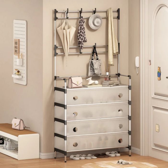 - يشغل رف المعاطف مساحة صغيرة ولكنه يحتوي على مساحة تخزين كبيرة للحفاظ على مساحتك مرتبة ومنظمة. تصميم ستارة باب بلاستيكية، تمنع الغبار والأوساخ