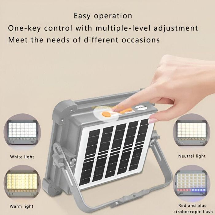 يوفر لك هذا المصباح إضاءة قوية ومستدامة في مواقع العمل بفضل الشحن الشمسي المزدوج والبطارية التي تدعم شحن أجهزتك عبر منافذ الطاقة المدمجة مما يجعله أداة عملية لا غنى عنها في حالات الطوارئ والمهام الخارجية الصعبة