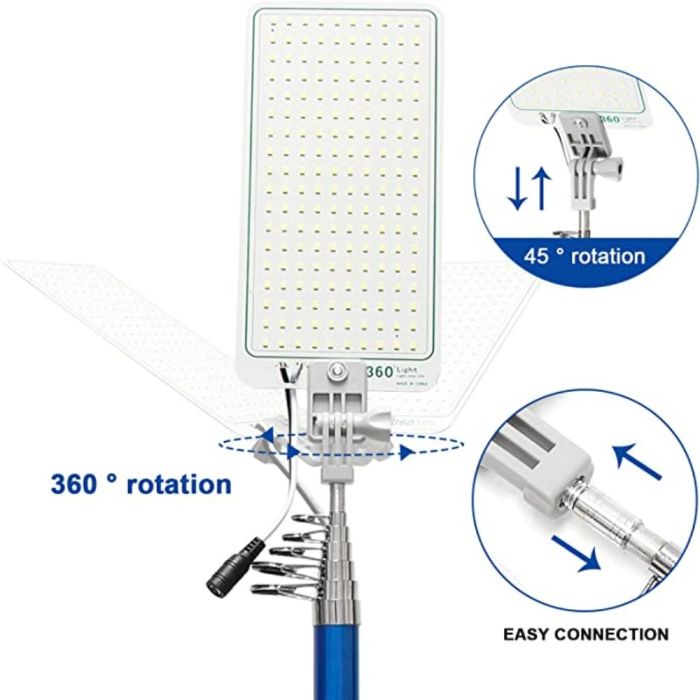 كشاف تلسكوبي LED بتصميم قابل للتمدد للأنشطة الخارجية مثل الحداق والمخيم والسفر، مجهز بعصا طويلة قابلة للتعديل تصل إلى 3.6 متر، ولوحة مزودة بـ 180 مصباح LED تعمل حتى 30000 ساعة، مع إمكانية ضبط مستوى السطوع ووضع التشغيل من مسافة بعيدة وأكثر
