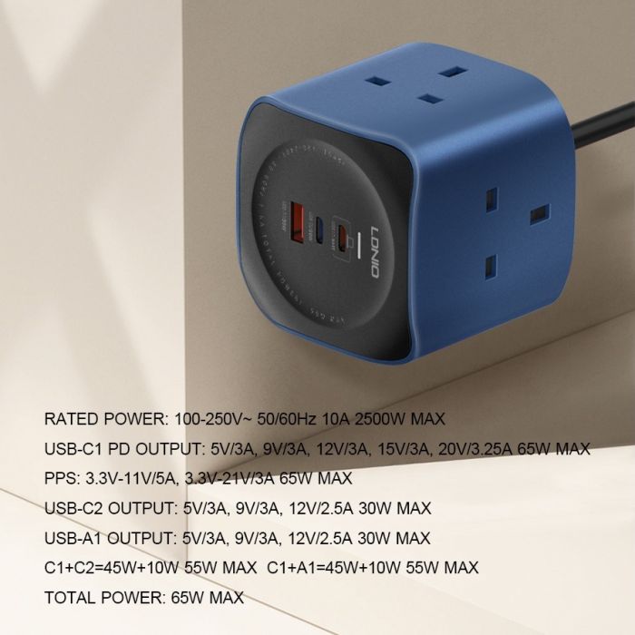 حل شحن قوي وموفر للمساحة، مصمم لتلبية احتياجات المنزل والمكاتب الحديثة. يحتوي على 3 مقابس كهرباء و3 منافذ USB عالية السرعة بما في ذلك منفذ USB-C PD بقوة 65 واط، مما يسمح لك بشحن وتشغيل ما يصل إلى 6 أجهزة في وقت واحد. متوافق مع بروتوكولات الشحن السريع PD3.0 وQC3.0، ويُعد مثاليًا للهواتف الذكية والتابلت وأجهزة اللابتوب. مزود بأنظمة حماية متعددة لتوفير طاقة آمنة وموثوقة لجميع أجهزتك