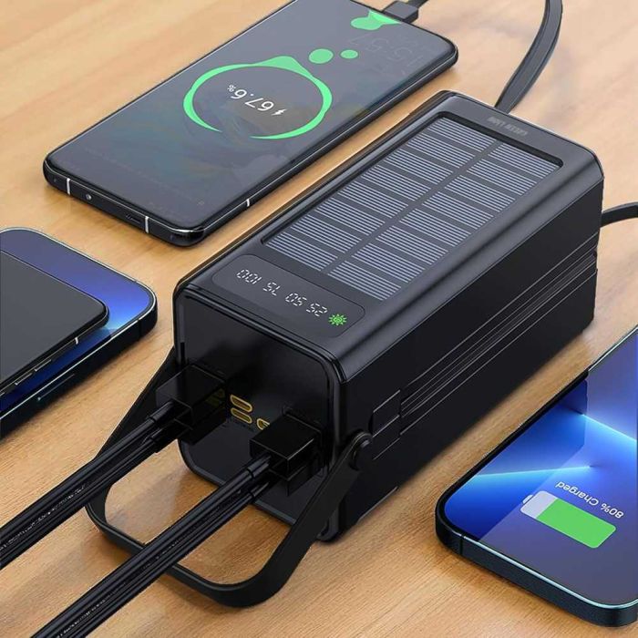 تمنحك هذه البطارية العملاقة طاقة لا تنفد لعدة أيام بفضل سعتها الضخمة التي تصل إلى 60000 مل أمبير مع 4 كيبيلات مدمجة تغنيك عن حمل الأسلاك ودعم كامل للشحن الشمسي والسريع مما يجعلها الرفيق المثالي لرحلات التخييم الطويلة والمغامرات الخارجية.