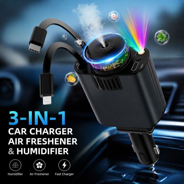- شاحن سيارة سريع 66 واط 5 في 1 بكابلين قابلين للسحب مع معطر وإضاءة