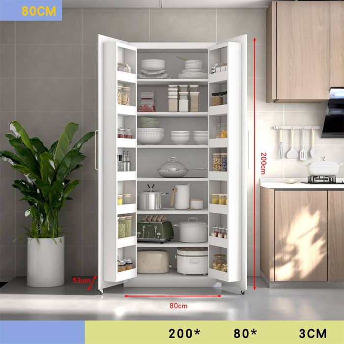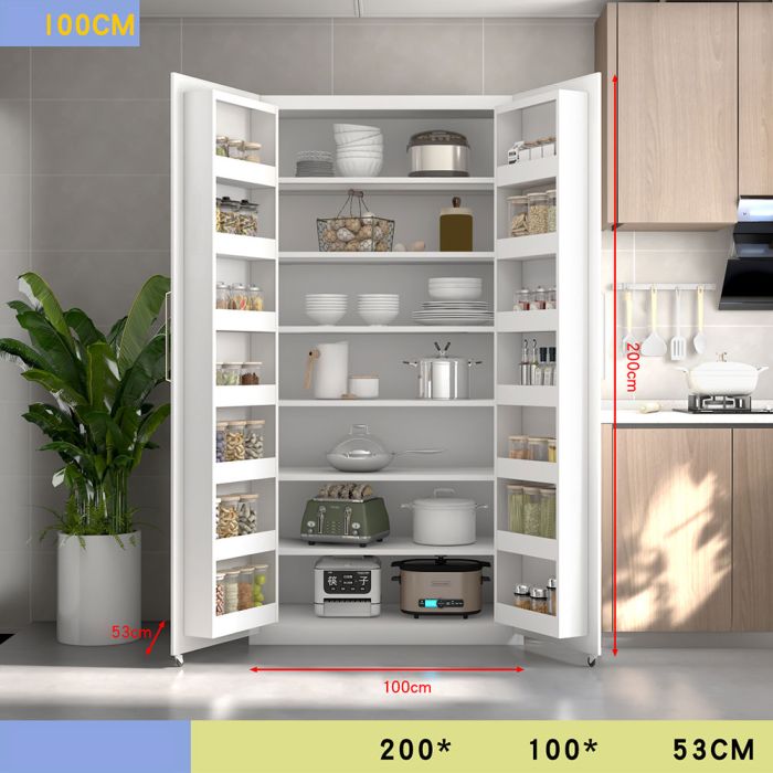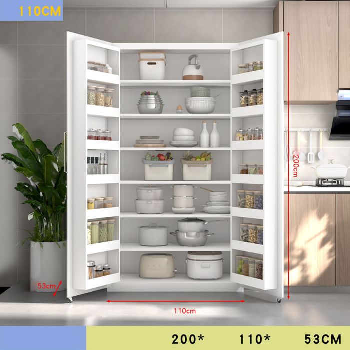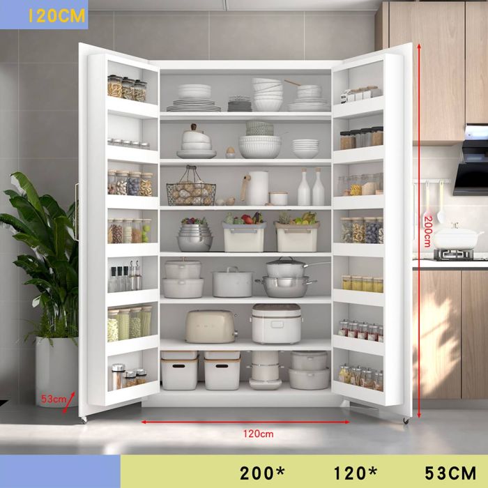 منظم مطبخ معدني 7 طبقات بتصميم عملي يوفر مساحة تخزين كبيرة مع أبواب أمامية وأرفف جانبية مدمجة، يساعد على ترتيب الأواني والأجهزة الغذائية بشكل منظم، مناسب لاستغلال المساحات الضيقة ويمنح المطبخ مظهرًا أنيقًا ومرتبًا