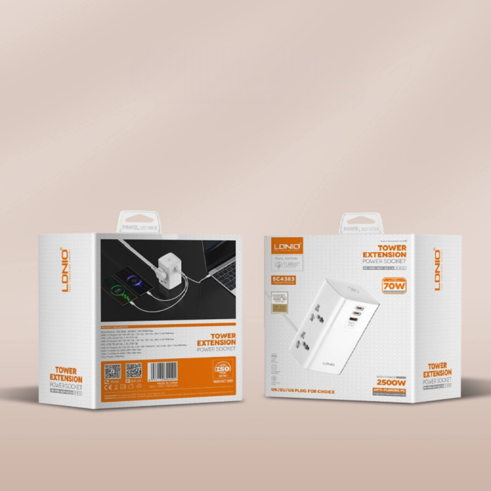 - وصلة اشتراك كهربائي 4 مخارج مع منفذ USB و2 منفذ USB-C PD بقوة 70 واط 2 متر من LDNIO