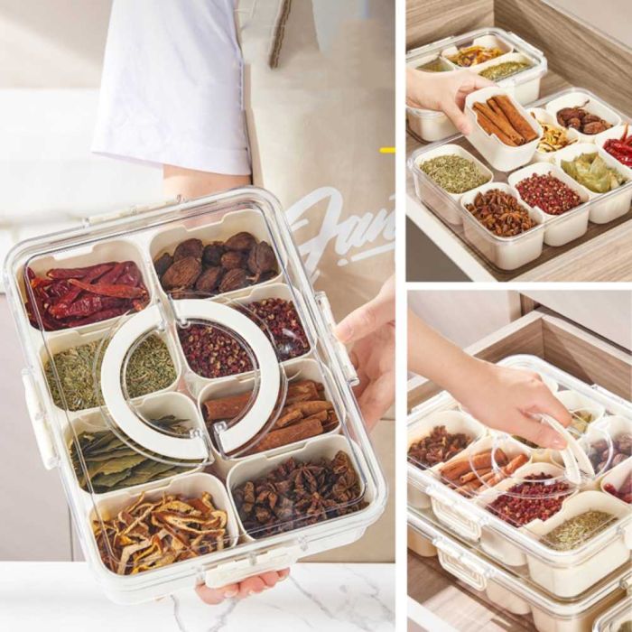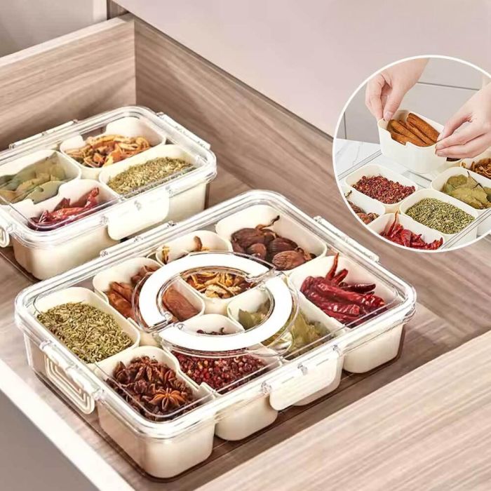 صينية تقديم 8 أقسام تحافظ على المكسرات والحلويات والفواكه المجففة والتوابل طازجة. واسعة بما يكفي لتقديم كميات وفيرة. كما أنها مزودة بغطاء شفاف محكم الإغلاق بمشابك قفل ومقبض قابل للطي، مع أقسام قابلة للإزالة لسهولة التنظيف والتخزين في الأدراج أو الثلاجة