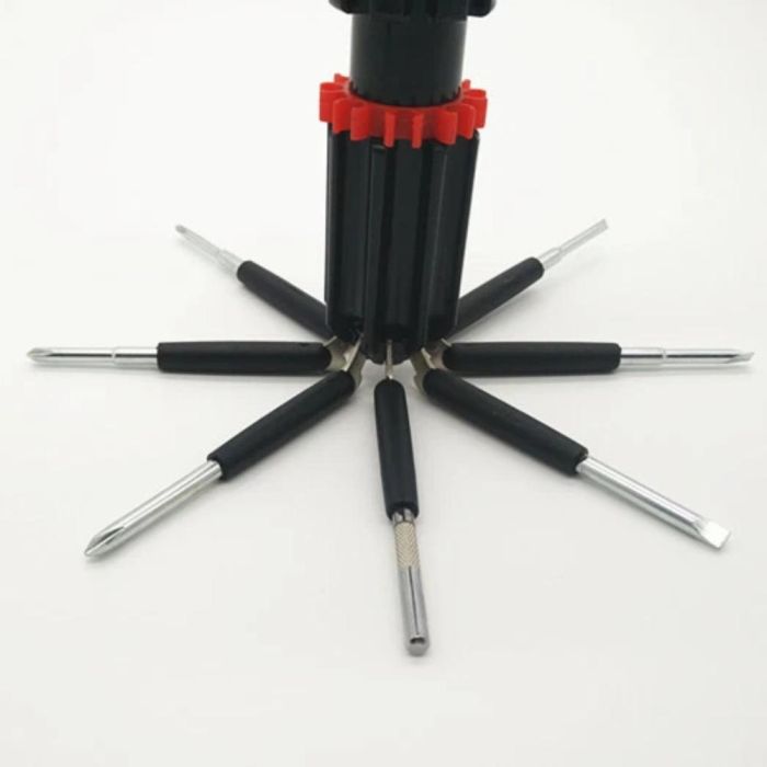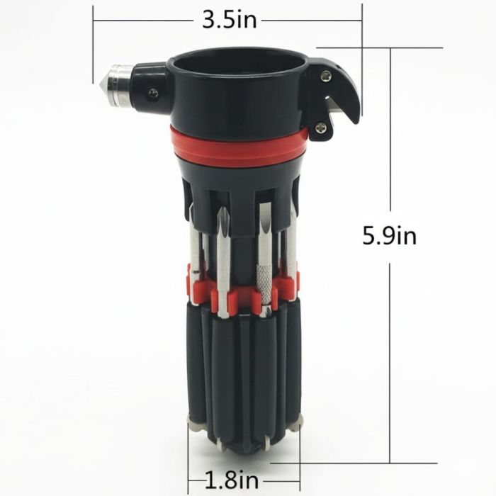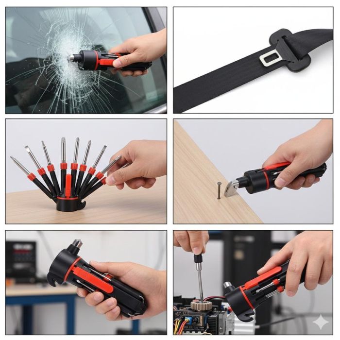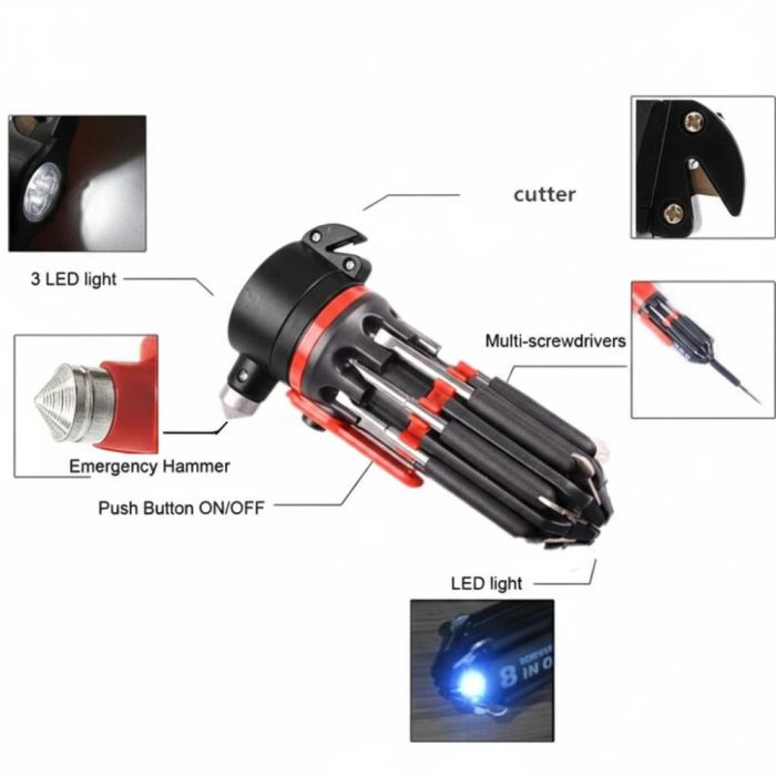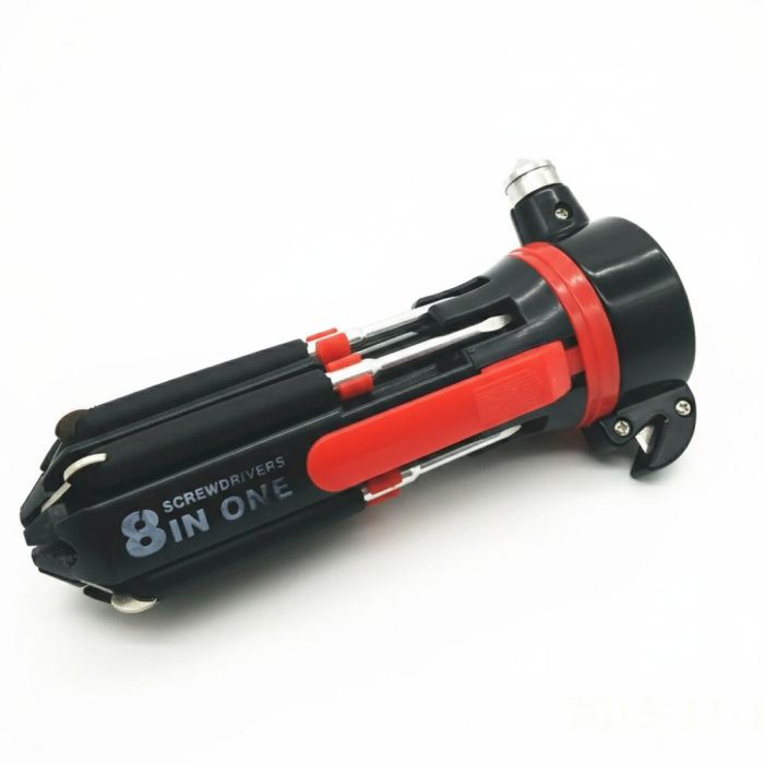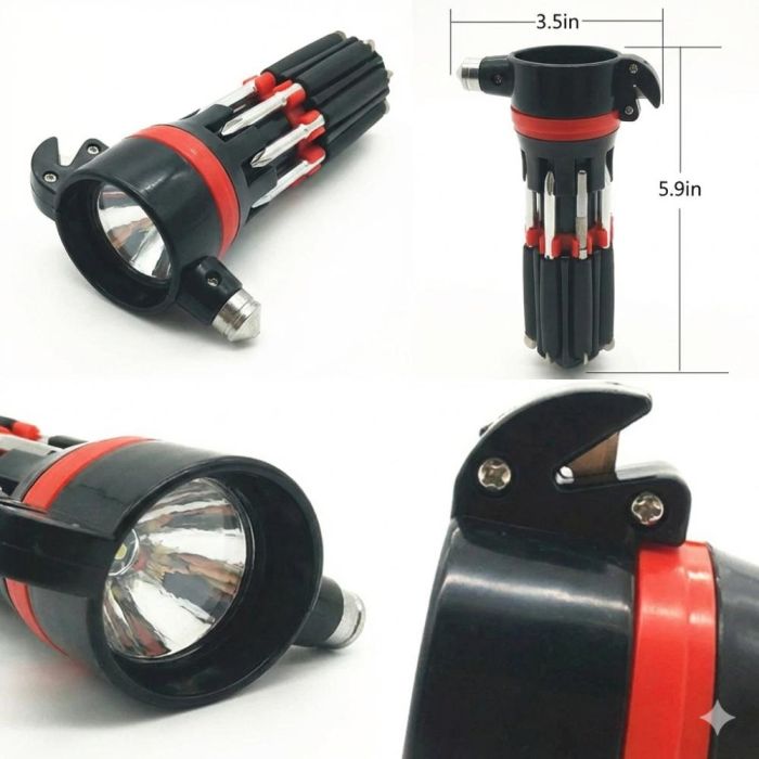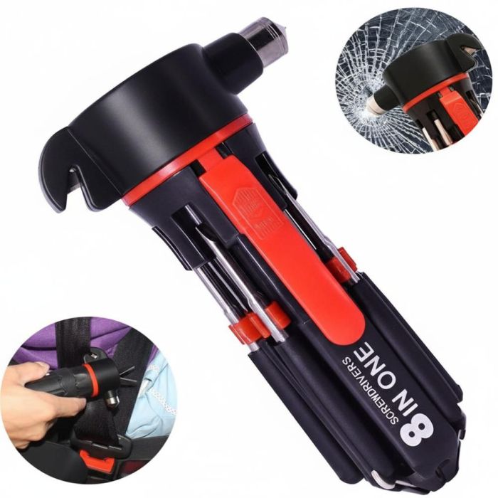 تم تصميم هذا المفك متعدد الوظائف ليكون أداة أساسية في السيارة أو المنزل، حيث يجمع بين 8 رؤوس مفكات مختلفة لتلبية معظم احتياجات الإصلاح اليومية، بالإضافة الى كاسر زجاج ومشرط لقطع حزام الأمان، ما يجعله مثالياً للاستخدام في حالات الطوارئ. كما يحتوي على كشاف LED مدمج يوفّر إضاءة عملية أثناء العمل في الأماكن المظلمة.