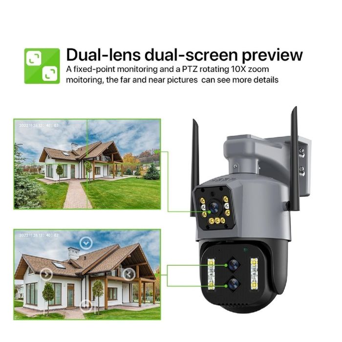 امنح ممتلكاتك حماية أمنية لا تضاهى مع هذه الكاميرا المتطورة التي تتيح لك مراقبة مساحات شاسعة بدقة 8 ميجابكسل وتقنية العدسات الثلاثية الفريدة. بفضل ميزة الشاشتين والتقريب الذي يصل إلى 10x، لن تفوتك أي تفاصيل دقيقة سواء كانت قريبة أو بعيدة، بينما يضمن لك نظام التتبع الذكي بالذكاء الاصطناعي استلام تنبيهات دقيقة عند رصد أي حركة