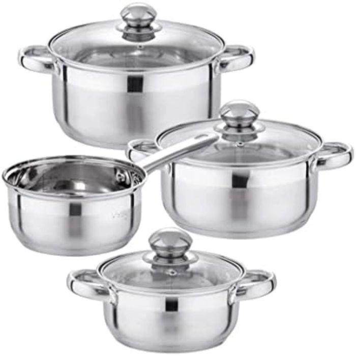 طقم أواني طهي متكامل من الستانلس ستيل عالي الجودة بلمسة أنيقة، مناسب للاستخدام اليومي والطهي الصحي. يتميز بجودة تصنيع عالية لضمان توزيع حرارة متوازن وعمر استخدام طويل. يأتي بأغطية زجاجية مقواة تسمح بمتابعة الطهي دون فتح الغطاء، مع فتحات تهوية للبخار.