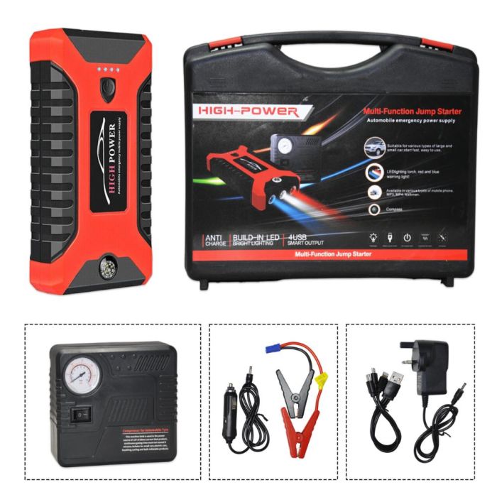 - بطارية طوارئ احتياطية للسيارة 99800 مل أمبير 4 منافذ USB وكشاف مع مضخة هواء