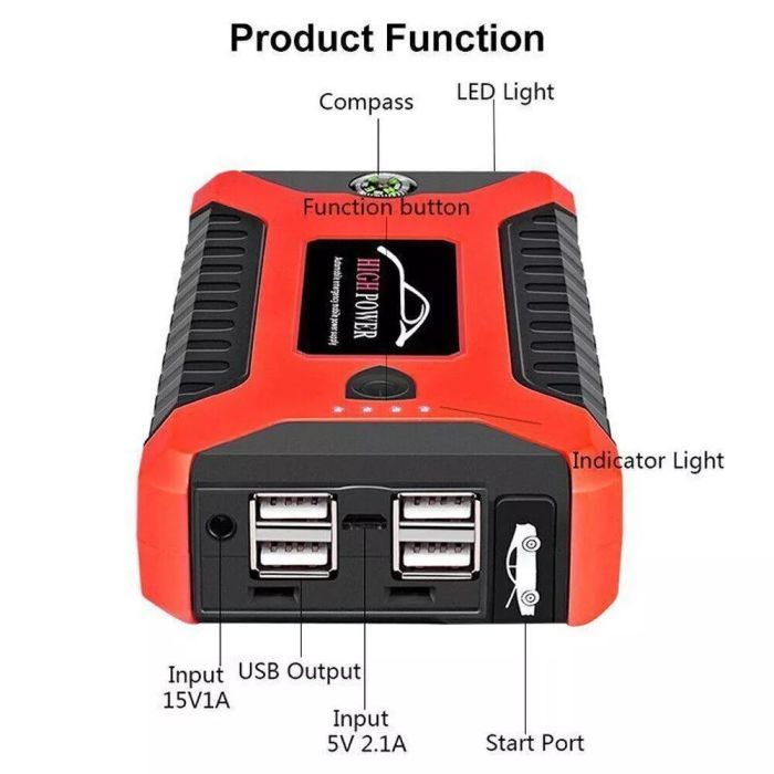 تخلص من المواقف الصعبة باستخدام هذه البطارية، فهي أداة أساسية لأي سيارة، تحتوي على 4 مخارج USB لشحن الهواتف والأجهزة الأخرى، وتوفر الحماية من التيار الزائد والماس الكهربائي والتيار العكسي، كما يوفر مؤشر الطاقة معلومات في الوقت الفعلي عن حالة البطارية ومستويات الشحن، بينما يوفر الكشاف المدمج الإضاءة في البيئة المظلمة