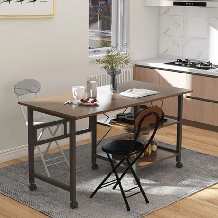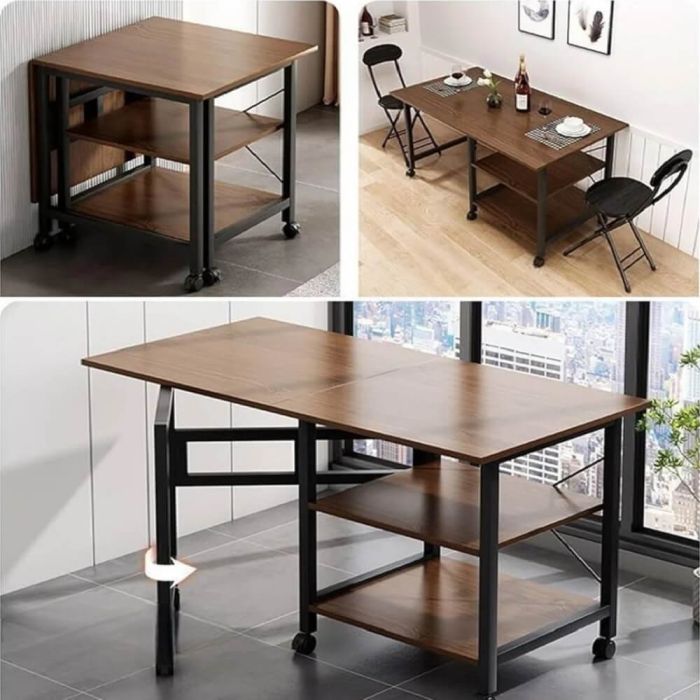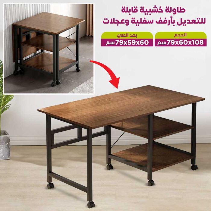 أضف لمسة عملية وعصرية لمنزلك مع هذه الطاولة الخشبية، فهي قابلة للتعديل مع أرفف سفلية وعجلات، حيث يمكنك استخدامها كطاولة سفرة أو مكتب منزلي أو طاولة جانبية بفضل تصميمها الذكي الذي يتيح تعديل حجمها وطيها بسهولة لتوفير المساحة. الأرفف السفلية تمنحك مساحة إضافية لتخزين الكتب أو الديكورات أو أي استخدام يناسبك احتياجاتك، في حين تتيح العجلات المتحركة نقل الطاولة بثبات وسهولة إلى أي مكان. فهي مثالية للمطبخ، غرفة المعيشة أو حتى المكاتب الصغيرة، حيث تجمع بين المتانة والأناقة لتلائم جميع احتياجاتك اليومية