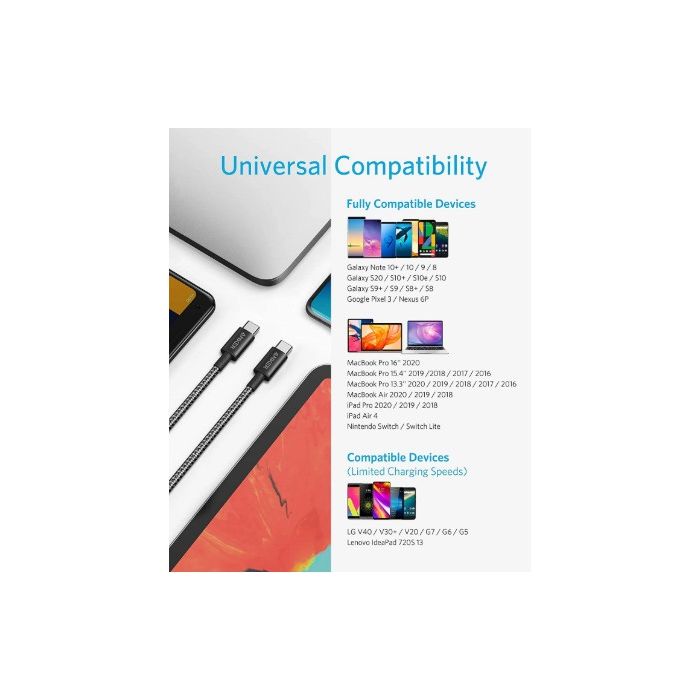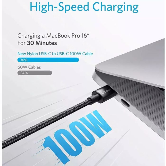 قم بترقية تجربة الشحن الخاصة بك باستخدام كابل Anker USB-C إلى USB-C. تم تصميم هذا الكابل المتين للغاية ليدوم طويلاً، مع طبقة خارجية من النايلون المضفر الفاخر وموصلات معززة. استمتع بسرعات شحن فائقة تصل إلى 100 وات، وذلك بفضل توافقه مع تقنية Power Delivery (PD) 3.0.
