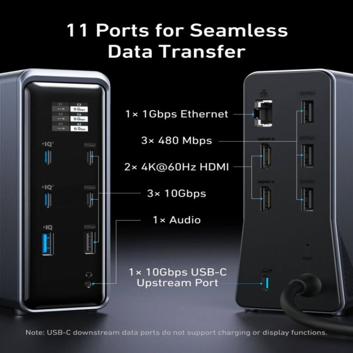 محطة مكتبية قوية ترتّب مكتبك عبر جمع الشحن والعرض ونقل البيانات والشبكة والصوت في جهاز واحد أنيق. مع وحدة طاقة مدمجة بتقنية جان وقدرة إجمالية تصل إلى 160 واط، تستطيع شحن عدة أجهزة مع تشغيل شاشتين بدقة 4 كي وتردد 60 هرتز عبر منفذي إتش دي إم آي. نقل بيانات حتى 10 جيجابت في الثانية، شاشة ذكية لعرض المعلومات بسرعة، وتصميم رأسي يوفر مساحة ويمنح مظهراً مرتباً.