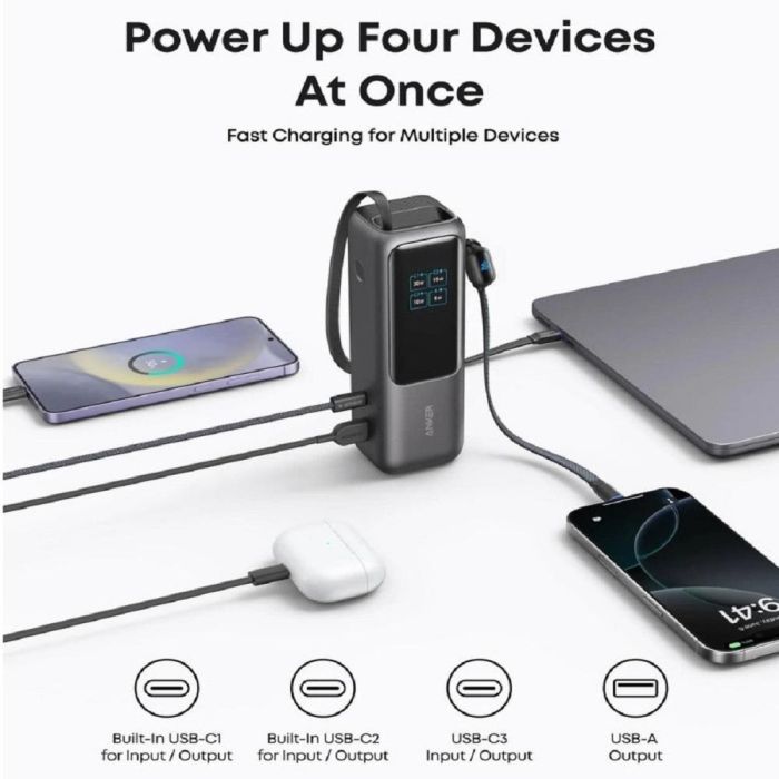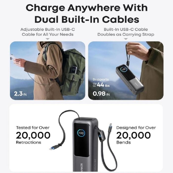 بطارية احتياطية 25000 مل أمبير ثنائية المنافذ 165 واط مع كيبلات USB-C مدمجة وقابلة للسحب من Anker