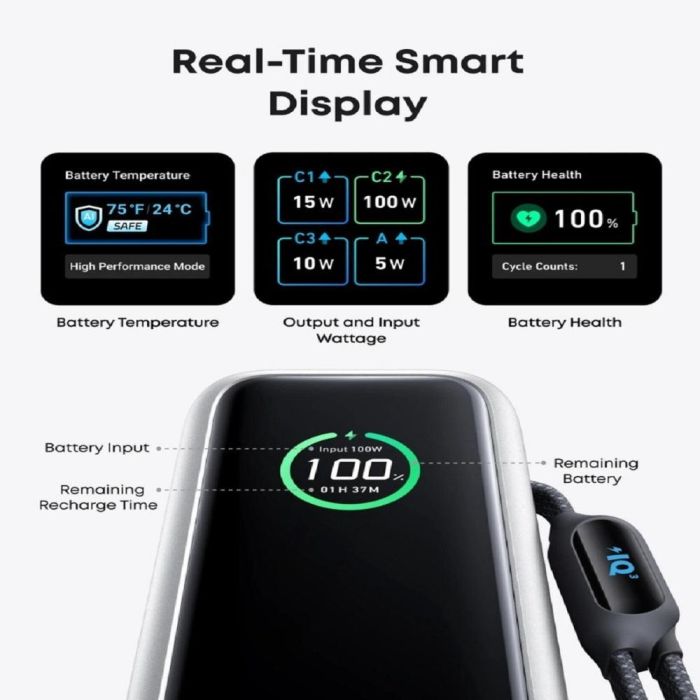 - شاشة ذكية تعرض نسبة البطارية المتبقية، قوة مخرج الطاقة، والوقت المقدر لإعادة الشحن