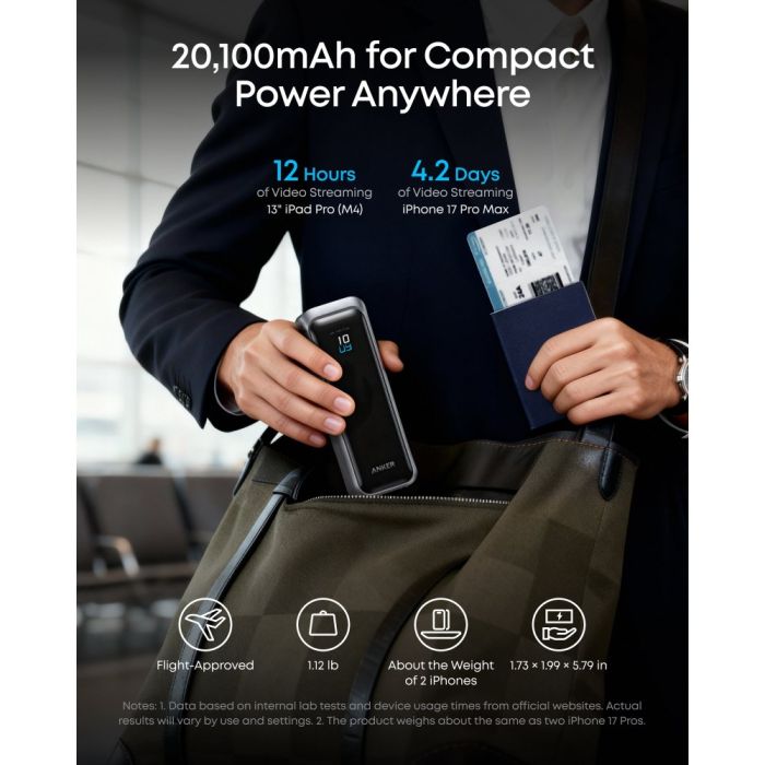 - بطارية احتياطية Anker Prime بقدرة 220 واط سعة 20000 مل أمبير بثلاثة منافذ شحن