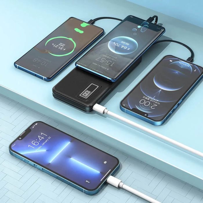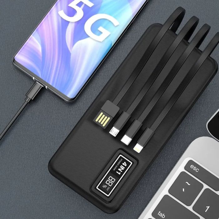 بلغني عند التوفربطارية احتياطية قوية يمكن شحنها باستخدام منافذ USB وUSB-C، تأتي بسعة هائلة وشحن سريع بقوة 10000 مل أمبير. كما تحتوي أيضاً على كيبلات USB، Type C، Micro USB، Lightning مدمجة لشحن أجهزتك دون الحاجة إلى أي كيبلات إضافية، كما أنها تدعم معظم الهواتف عبر تقنيات PD وQC 3.0. مصنوعة من مواد مقاومة للحريق وتوفر وظائف حماية متعددة، مع شاشة ديجتال لعرض المتبقي من عمر البطارية مما يجعلها آمنة ومناسبة للاستخدام اليومي أو أثناء السفر