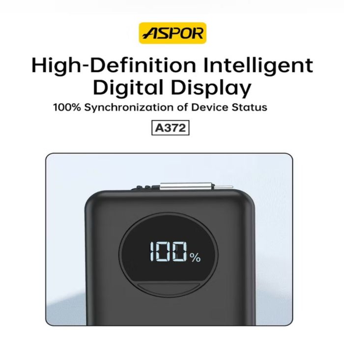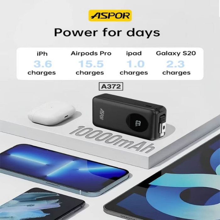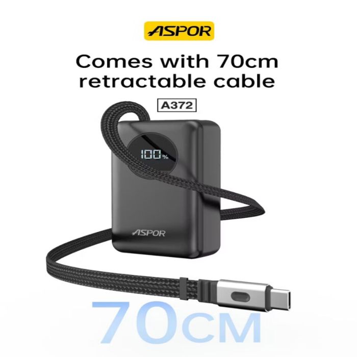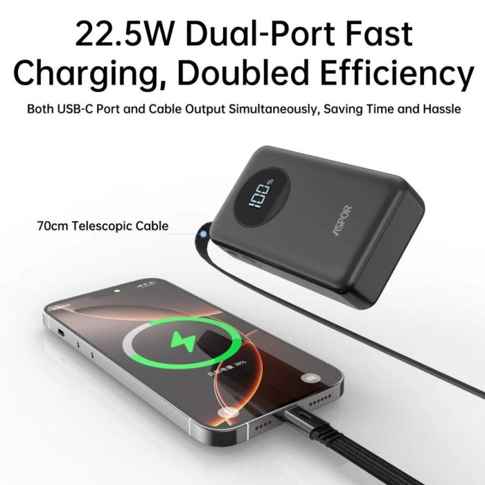 - بطارية احتياطية بسعة 10000 مللي أمبير وقوة 22.5 واط مع كابل قابل للسحب مدمج من ASPOR