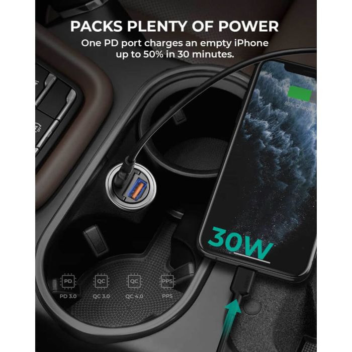 - شاحن سيارة PD بمنفذ مزدوج 30 واط من Aukey