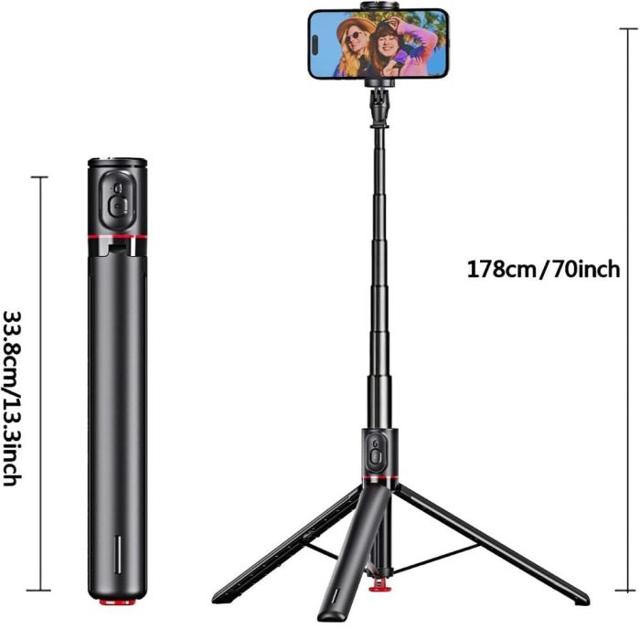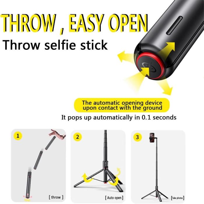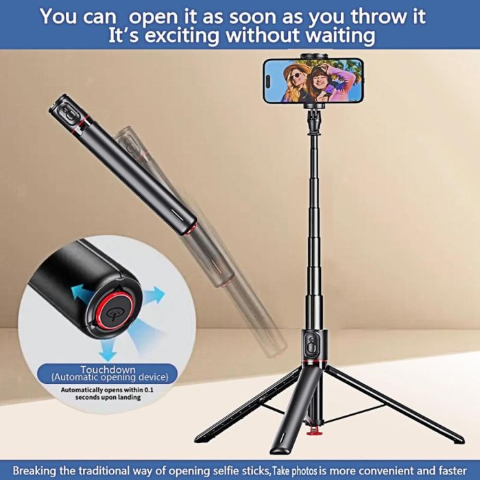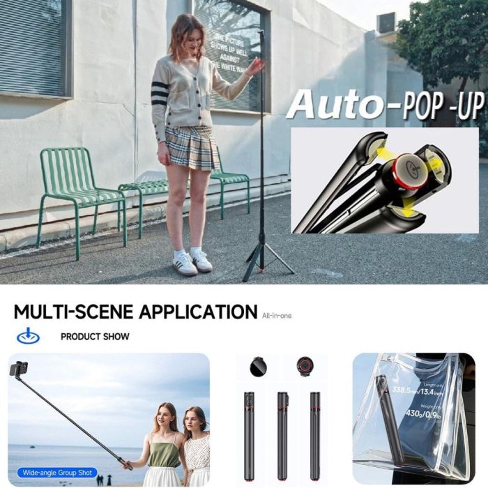 عصا سيلفي الكل في واحد تتحول إلى قاعدة ثلاثية القوائم مع وظيفة الفتح السريع، بمجرد إلقاء الجزء السفلي نحو الأرض، يتم فتح الأرجل تلقائياً لاستخدامها كقاعدة ثلاثية للهاتف، مزودة بعامود تلسكوبي من سبائك الألومنيوم بارتفاع قابل للتعديل ما يوفر نطاق مثالي لالتقاط الصور ومقاطع الفيديو من زوايا ومسافات مختلفة، مع ريموت مغناطيسي للتشغيل دون استخدام اليدين أثناء تسجيل الفيديو وجلسات التصوير، بالإضافة إلى قاعدة قوية مع وسادة أقدام من السيليكون مانعة للانزلاق