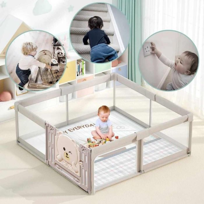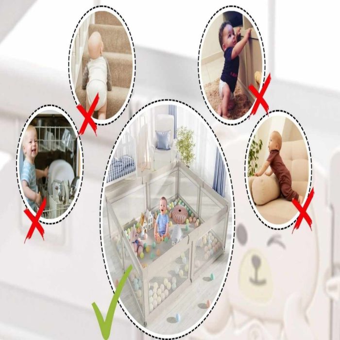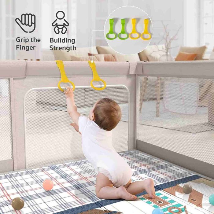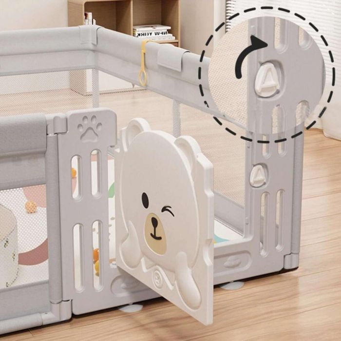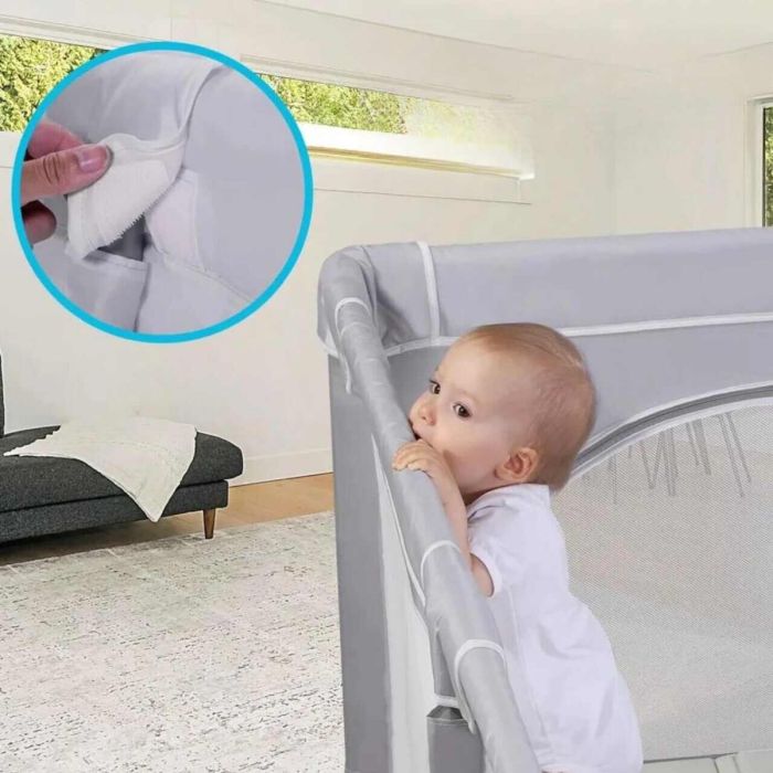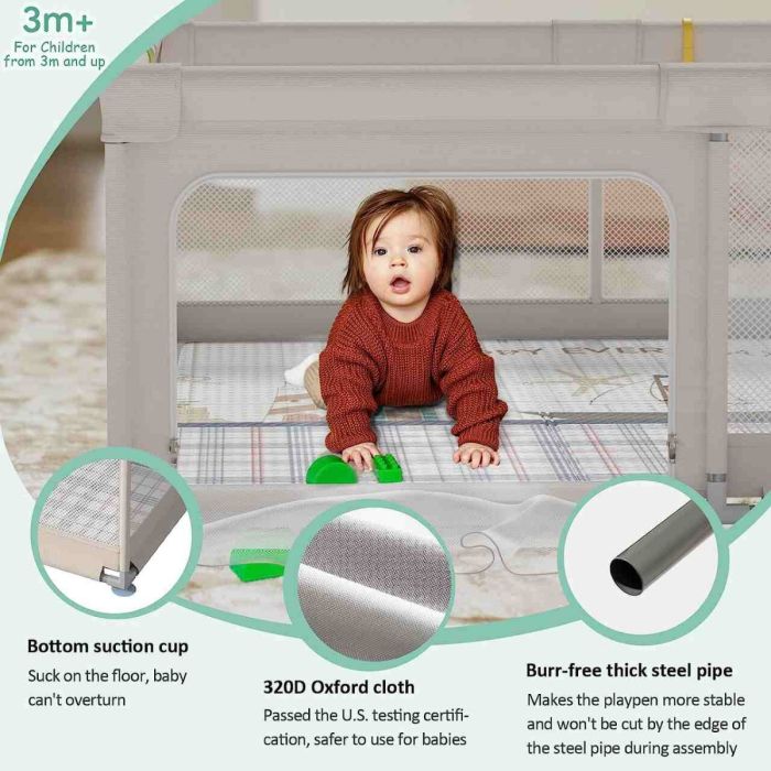 يوفر قفص لعب الأطفال بيئة آمنة تمنح الصغار حرية اللعب دون مخاطر، مما يتيح للوالدين راحة البال أثناء القيام بالمهام اليومية. بارتفاع 65 سم، لا يتمكن الطفل من تسلقه أو الخروج منه، بينما يضمن الإطار الفولاذي المزود بأكواب شفط ثباتًا قويًا. الأقمشة المصنوعة من أوكسفورد مع الجوانب الشبكية والإسفنج السميك حول القضبان تجعل التصميم آمنًا وودودًا للطفل. باب جميل بتصميم لطيف ينسجم مع ديكور المنزل ويغلق بإحكام، لمنع الطفل من فتحه. كما تضيف التفاصيل العملية مثل الأغطية الآمنة للعضّ وخطافات المساعدة على الوقوف قيمة إضافية تجعل القفص آمنًا ويساعد في التطور الحركي.