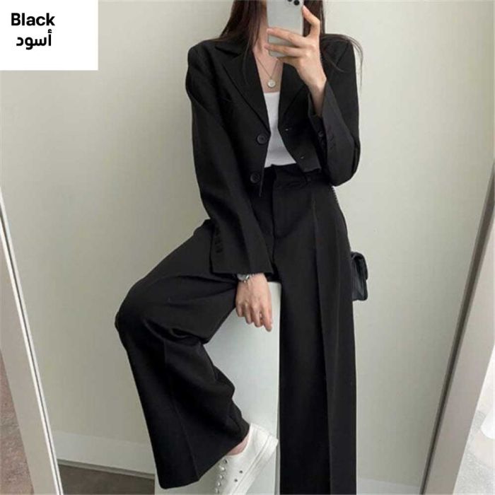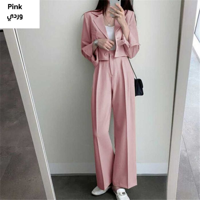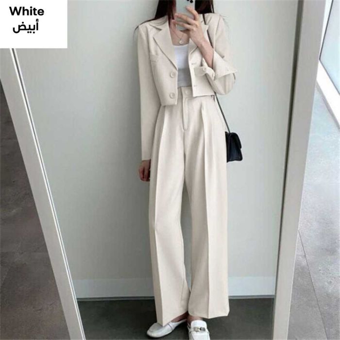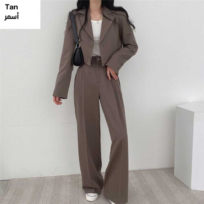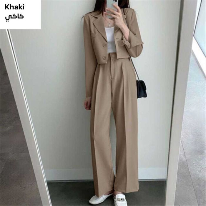 - طقم مكون من جاكيت قصير أنيق وبنطلون واسع الساق