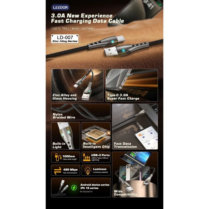 - تصميم من سبيكة الزنك لكابل بيانات متين وسريع الشحن بطول بطول 1 متر.