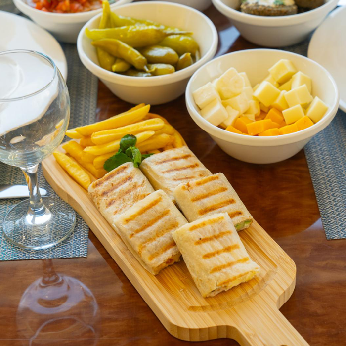 القائمة تشمل : حلوم صاج - فلافل - فول - حمص - فتة حمص - لبنة بلدية - اومليت اسبانيول - جبنة مشكلة - زبدة ومربى- خضار مقطع - كبيس وزيتون - مياه - شاي وقهوة .