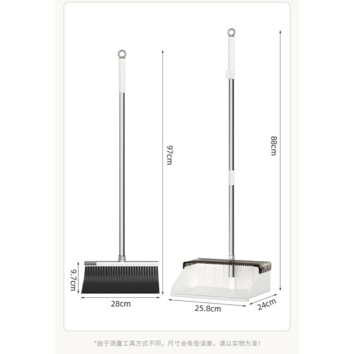 - الأبعاد: ارتفاع المكنسة 97 سم، ارتفاع المجرفة 88 سم، عرض رأس المكنسة 28 سم، ارتفاع الشعيرات 9.7 سم، وأبعاد قاعدة المجرفة 25.8 × 24 سم