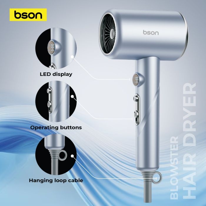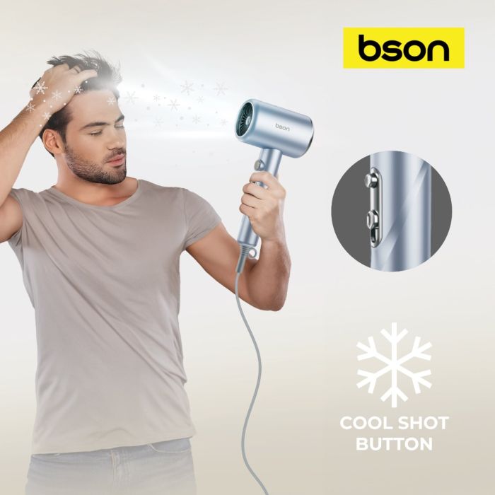 استمتعي بتصفيف شعركِ بمستوى صالونات التجميل مع مجفف الشعر Bson Blowster، المصمم لأداء قوي وآمن ودقيق. يعمل بمحرك قوي بقوة 1800 واط، ويتميز بشاشة LCD، وزر تبريد ذكي، وحماية من الحرارة الزائدة لتعزيز التحكم والسلامة. مع سرعتين تشغيل، و3 إعدادات حرارة، فهو مثالي لجميع أنواع الشعر، ويوفر تجفيفًا سلسًا وسريعًا سواء كنتِ في المنزل أو أثناء السفر أو في صالون التجميل.