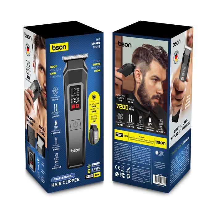 تتيح لك ماكينة الشعر الاحترافية من Bson الحصول على تجربة تصفيف شبيهة بالصالون في المنزل. يتميز بمحرك عالي الأداء بسرعة 7200 دورة في الدقيقة لتقطيع سلس وسريع لجميع أنواع الشعر، مع 6 مستويات قابلة للتعديل للتحكم في طول القص بدقة. تأتي الشفرات المصممة بعناية قابلة للغسل ومصنوعة لتدوم طويلاً، بينما يتيح التصميم المريح والصديق للبشرة تصفيفاً آمناً ومريحاً. كما يُظهر مؤشر LED حالة البطارية، ويضمن شحن USB Type-C السريع استعداد الجهاز للاستخدام في أي وقت