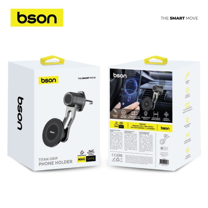 تمتع بقاعدة هاتف آمنة ومريحة للسيارة مع Bson Titan Grip MagSafe، مزودة بمغناطيس قوي ودوران 360 درجة لتثبيت هاتفك بسهولة أثناء القيادة.