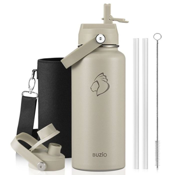 زجاجة مياه معزولة بغطاءين وحقيبة حماية 1 لتر من Buzio مصنوعة من ستانلس ستيل عالي الجودة، تحافظ على برودة المشروبات حتى 48 ساعة وحرارتها حتى 24 ساعة، مزودة بغطاء شفاط وغطاء فوهة لمرونة الاستخدام، تصميم مريح وسهل النقل، مثالية للرياضة والاستخدام اليومي
