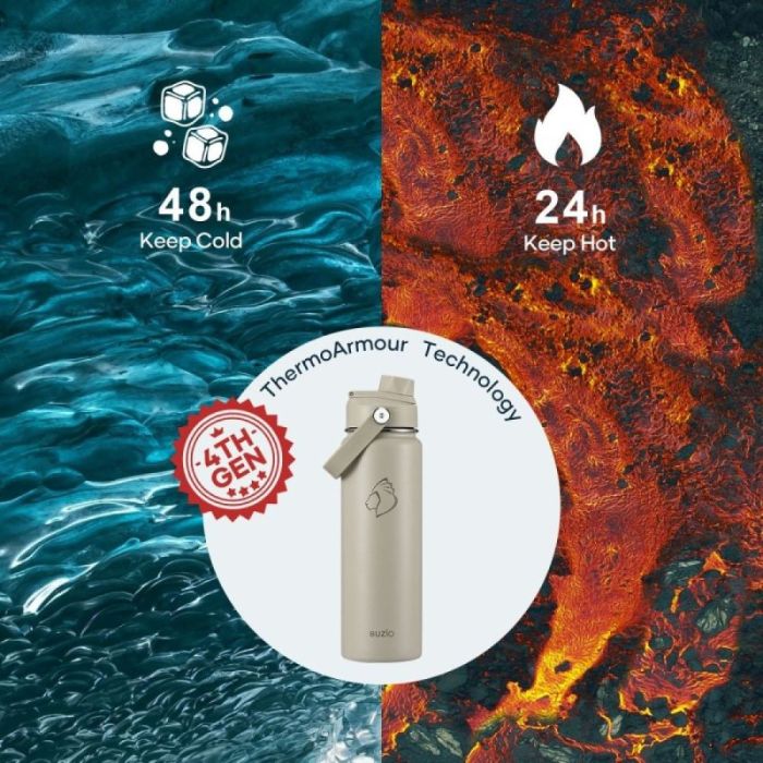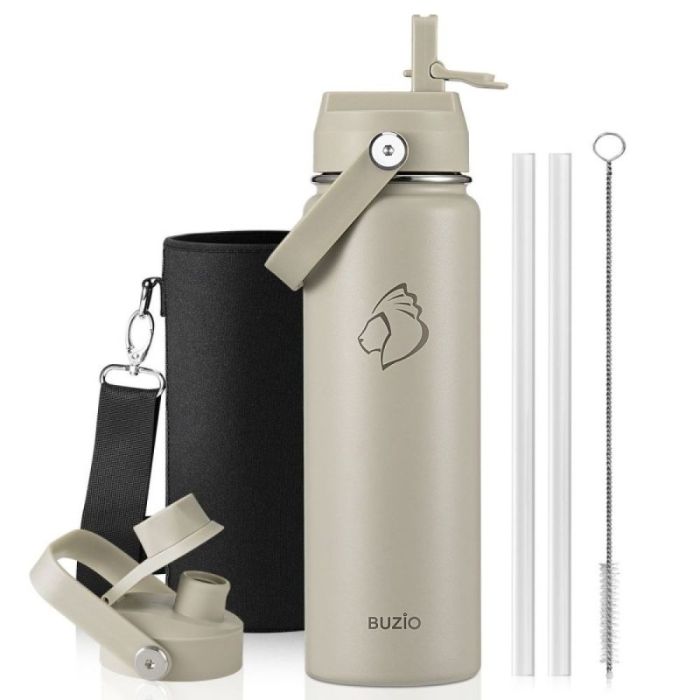 زجاجة مياه معزولة بغطاءين للشرب وغطاء حماية 700 مل من Buzio مصنوعة من ستانلس ستيل عالي الجودة، تحافظ على حرارة وبرودة المشروبات لفترات طويلة، مزودة بغطاء شفاط وغطاء فوهة لمرونة الاستخدام، تصميم مريح وسهل النقل، مثالية للاستخدام اليومي والرحلات