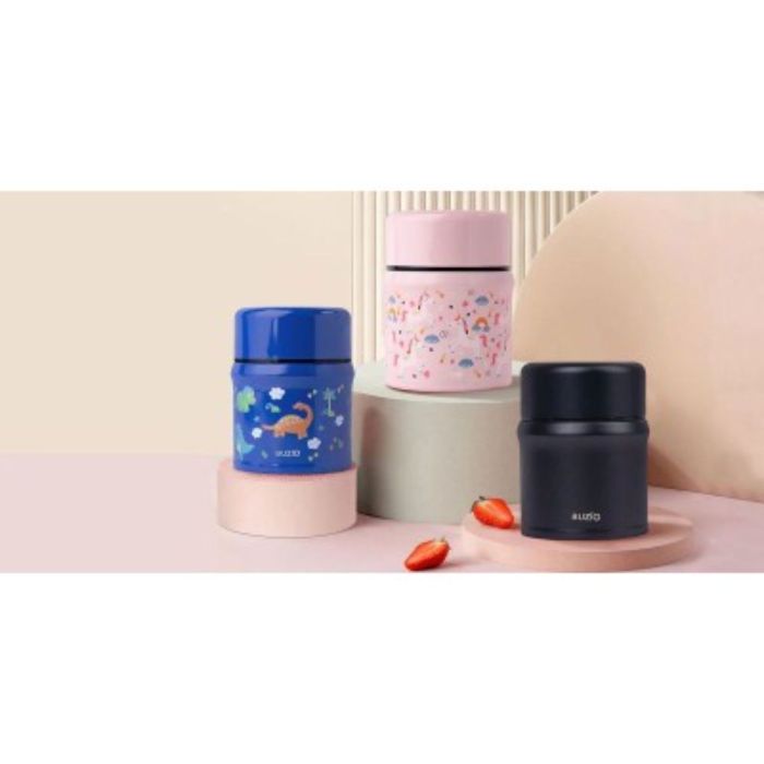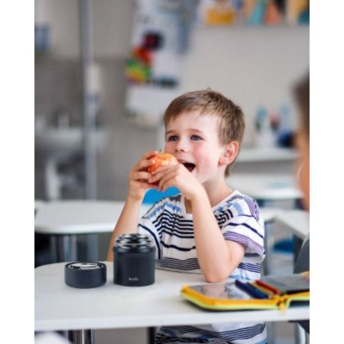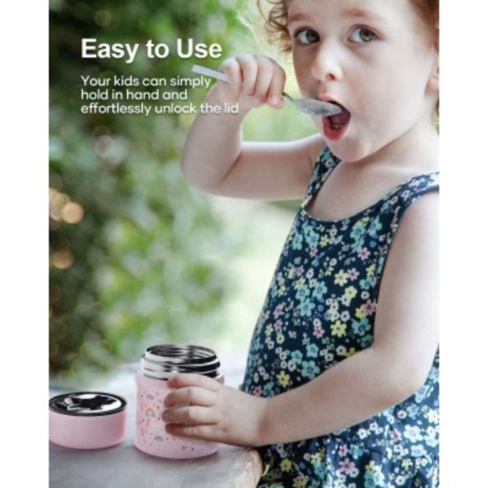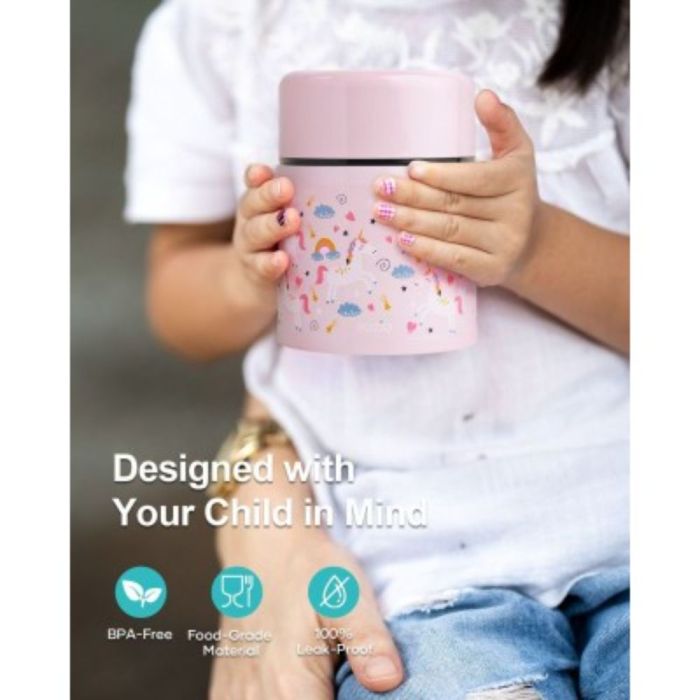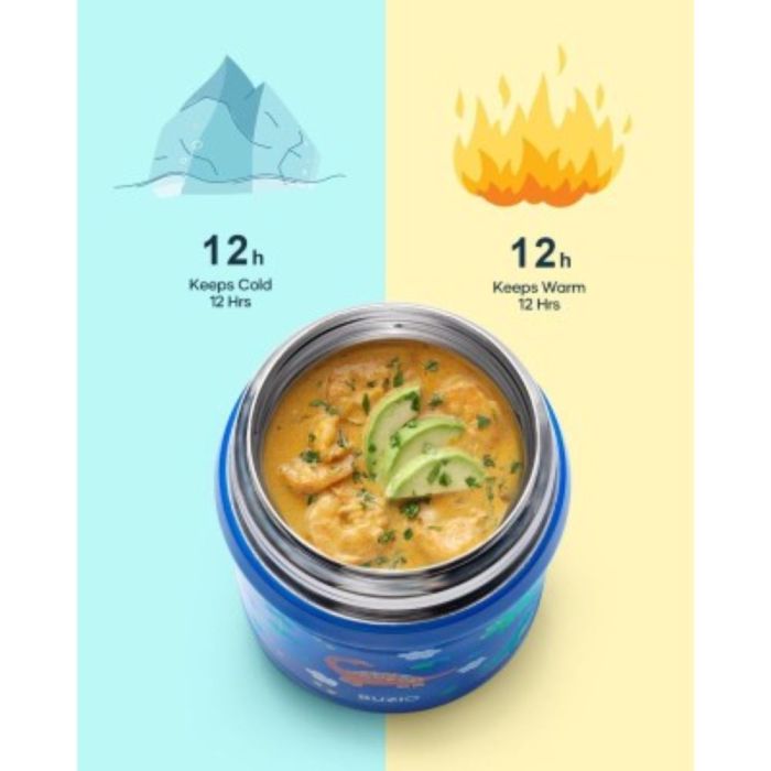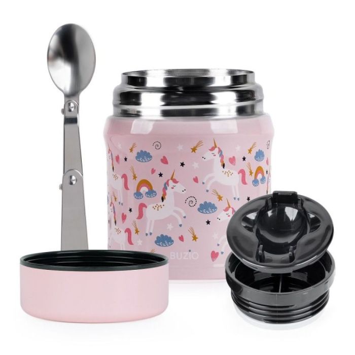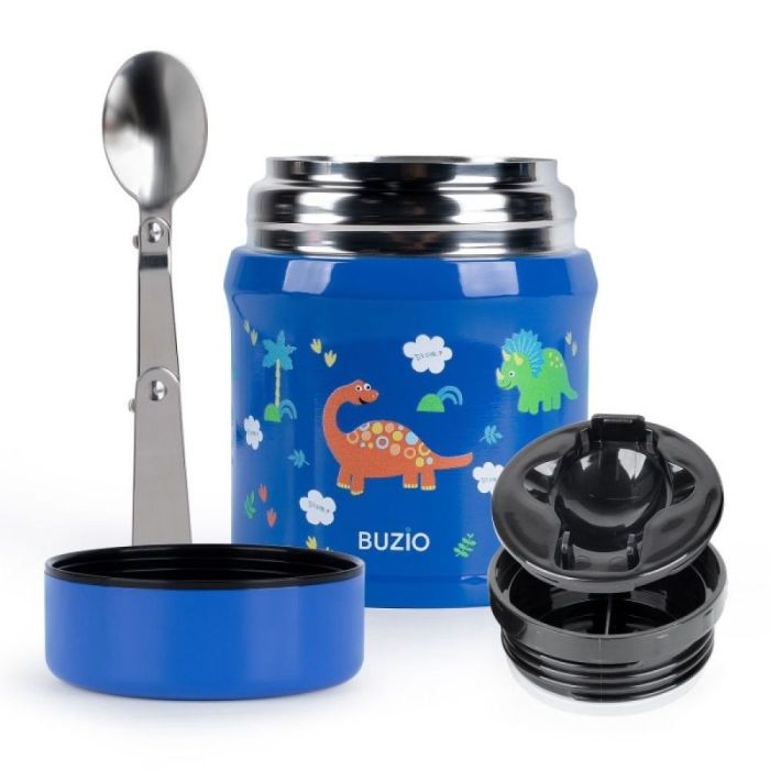 حافظة طعام أطفال ستانلس ستيل 350 مل من Buzio مصنوعة من ستانلس ستيل عالي الجودة، تحافظ على حرارة أو برودة الطعام حتى 12 ساعة، تصميم آمن وخفيف سهل الاستخدام، مناسبة لوجبات المدرسة والتنقل اليومي للأطفال