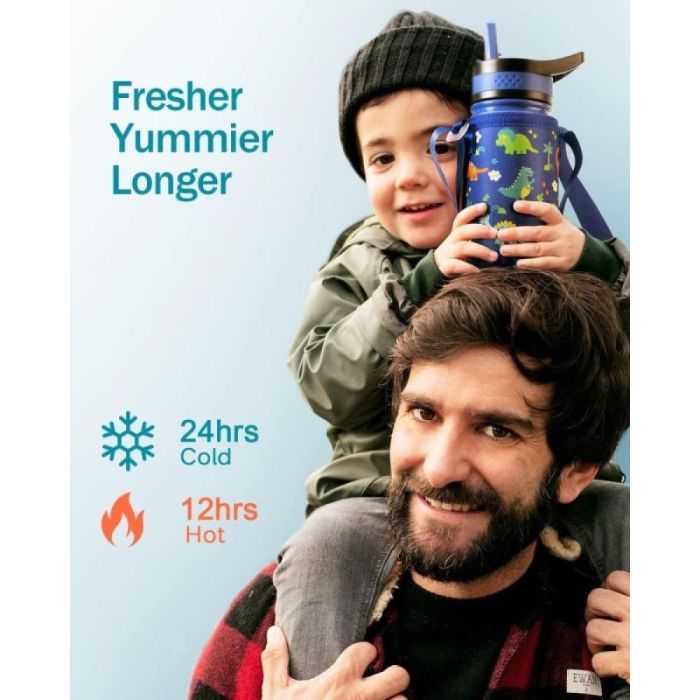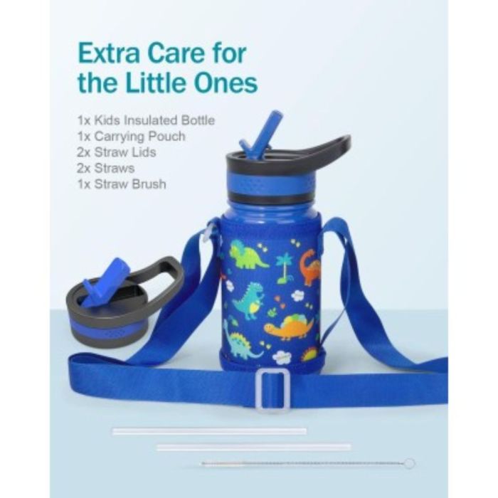 مطارة مياه Buzio للأطفال بغطاء وحافظة 500 مل مصنوعة من ستانلس ستيل عالي الجودة، تحافظ على برودة المشروبات لساعات، تصميم آمن وخفيف مع حزام مريح، سهلة الاستخدام، مناسبة للمدرسة والتنقل اليومي للأطفال