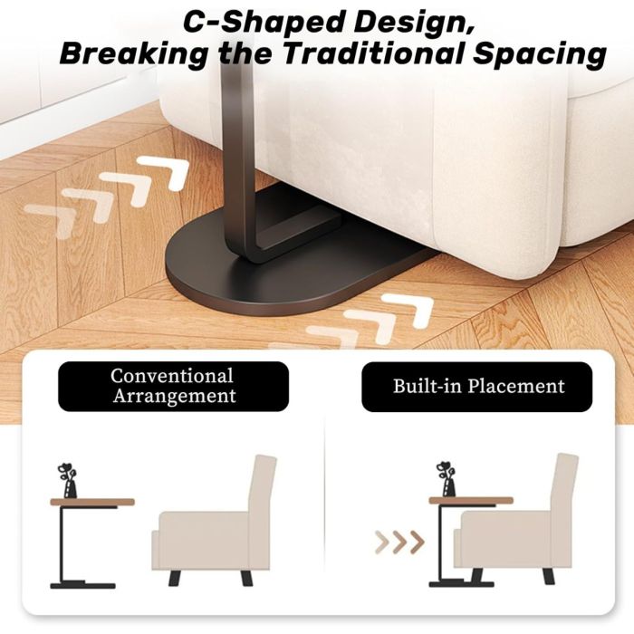 نظراً لتصميمها، يمكن لهذه الطاولة أن تُدفع بسهولة إلى جانب الأريكة أو الكرسي أو السرير لتسهيل الوصول إلى الوجبات الخفيفة والقهوة والريموت والهواتف والكتب، فهي مثالية للمساحات الصغيرة وتضفي لمسة فريدة لأي زاوية