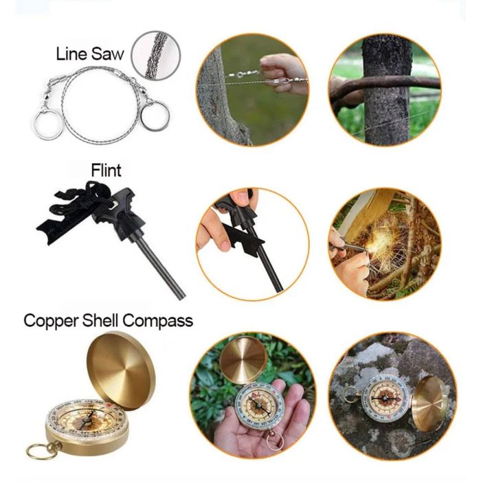 هذه المجموعة ليست مجرد حقيبة. فهي مجهزة بالكامل بأشرطة لاصقة طبية، ومقص ضمادات، وصافرة طوارئ، ودبابيس، وعصي إشعال النار، وسكين متعدد الاستخدامات، وسوار نجاة، ومصباح يدوي متين، وأضواء طوارئ، مع أدوات حيوية أخرى