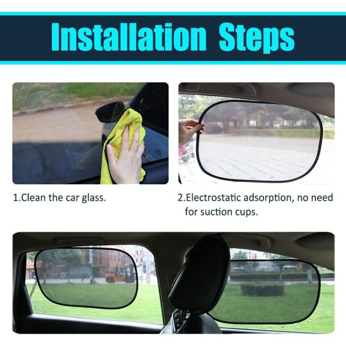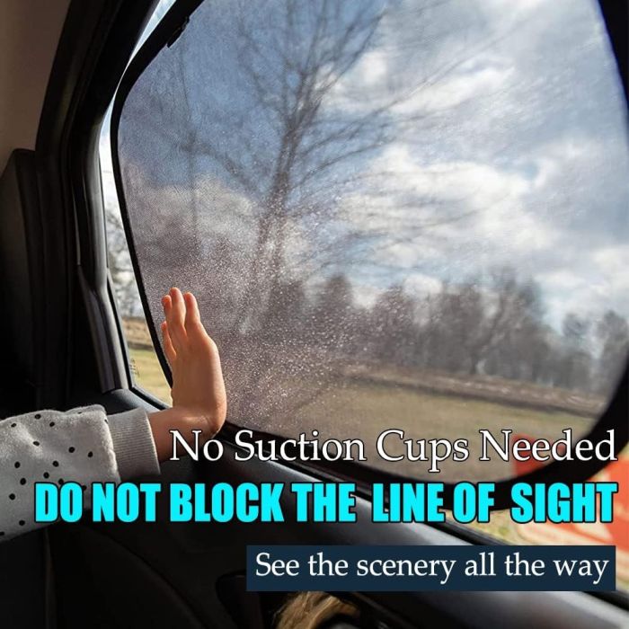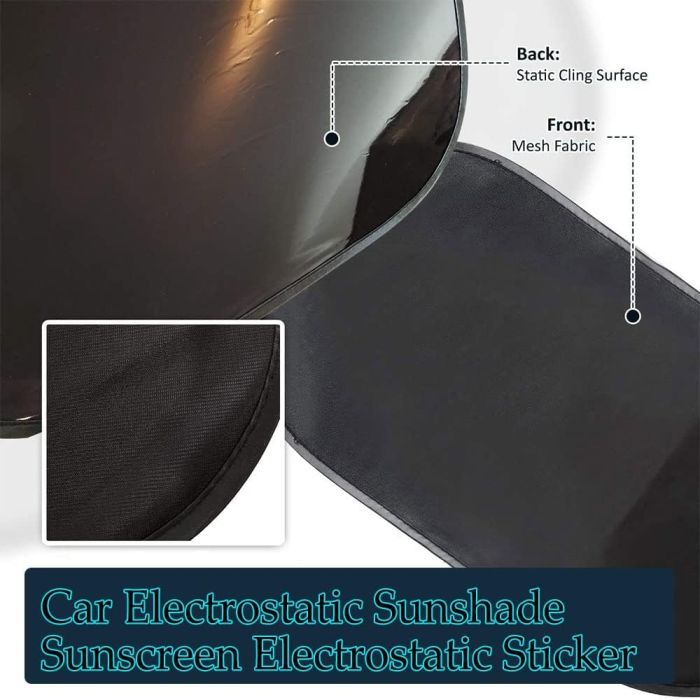 غطاء نافذة السيارة مصنوع من شبكة نايلون 80GSM ، وفيلم إلكتروستاتيكي 15S ، وسلك فولاذي. هذا النوع من ستائر النافذة ذاتية اللصق ويمكن ربطها بسهولة بالنافذة بدون أكواب شفط أو غراء. لن يترك أي أثر على النافذة.