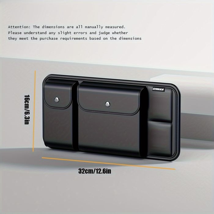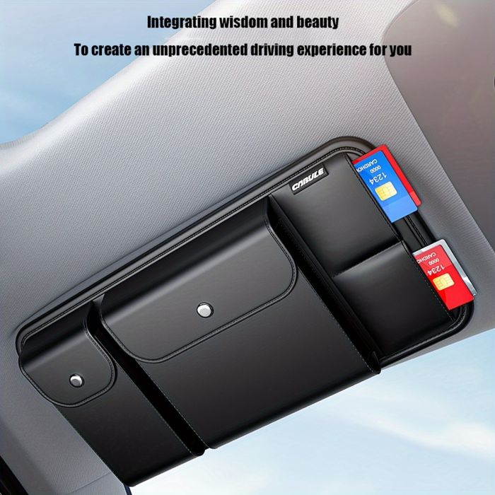 يتميز هذا المنظم المتعدد الجيوب والأقسام بتخزين نظاراتك ورخصة القيادة والتذاكر والبطاقات. مصمم ليتناسب بشكل آمن مع واقي الشمس في سيارتك، يضمن سهولة الوصول إلى الضروريات أثناء القيادة.