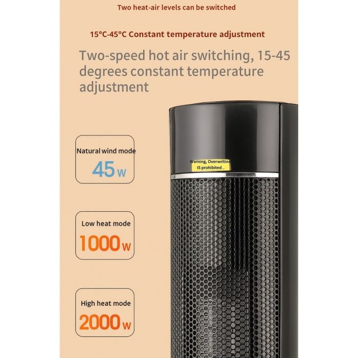 - أوضاع التشغيل: إعدادات حرارية مزدوجة: 2000 واط / 1000 واط، بالإضافة إلى وضع المروحة الطبيعي (45 واط).