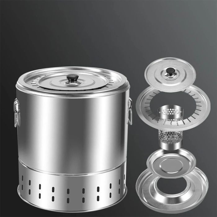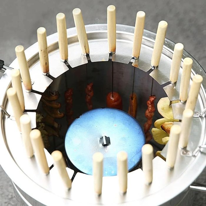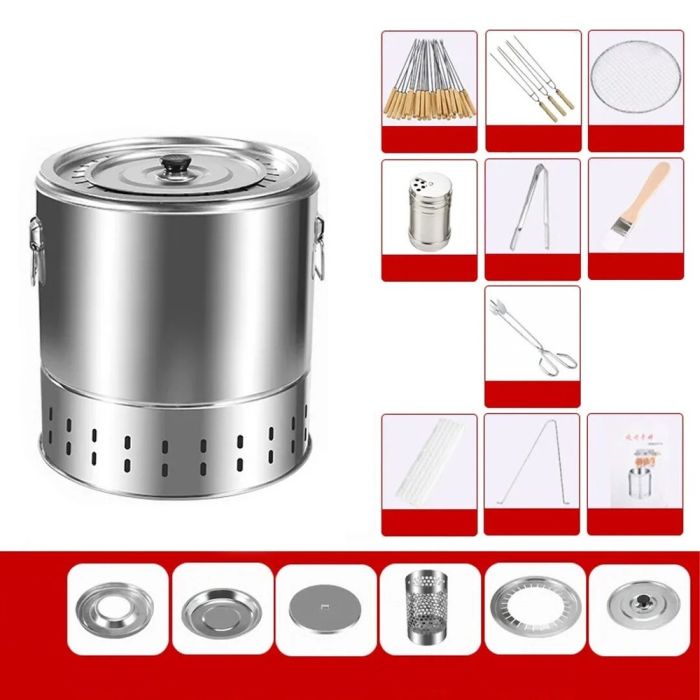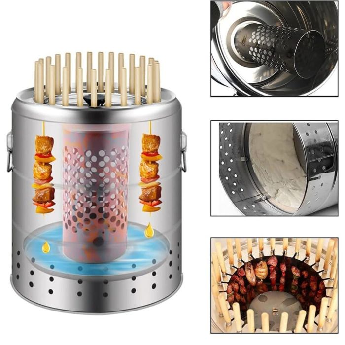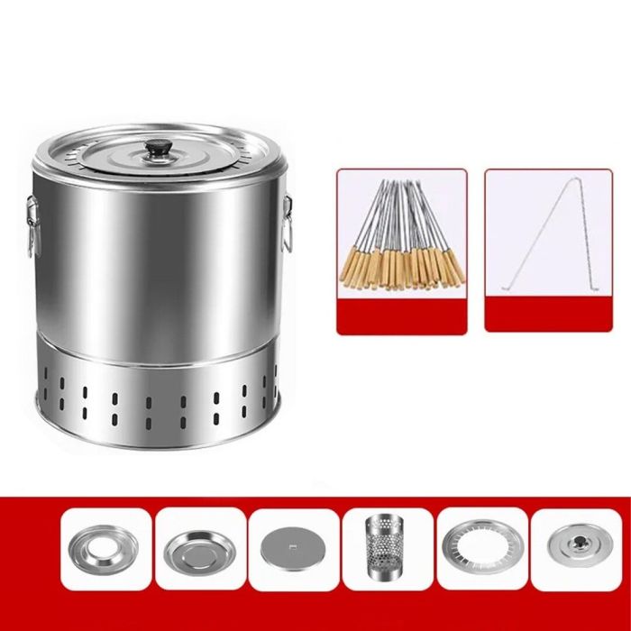شواء مثالي بفضل شواية فحم أسطوانية مصنوعة من ستانلس ستيل متين. تسخين متساوي 360°، تصميم عازل للحرارة، تتسع لـ28 سيخ للطهي الجماعي. مثالية للتجمعات العائلية والمغامرات الخارجية. الطقم يشمل جميع الأدوات الضرورية لضمان تجربة شواء مريحة وآمنة.