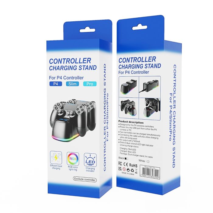 ارتق بتجربة الألعاب الخاصة بك مع هذا الملحق الأساسي! محطة شحن لوحدات تحكم PS4، تتميز بإضاءة RGB نابضة بالحياة. تشحن هذه القاعدة الأنيقة وحدتي تحكم في وقت واحد، مما يضمن جاهزيتهما دائما للعمل. تضيف مصابيح LED القابلة للتخصيص لمسة ديناميكية إلى مساحة اللعب الخاصة بك، بينما يتناسب التصميم الصغير بسلاسة مع أي رف أو مكتب